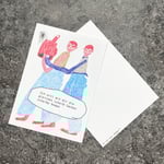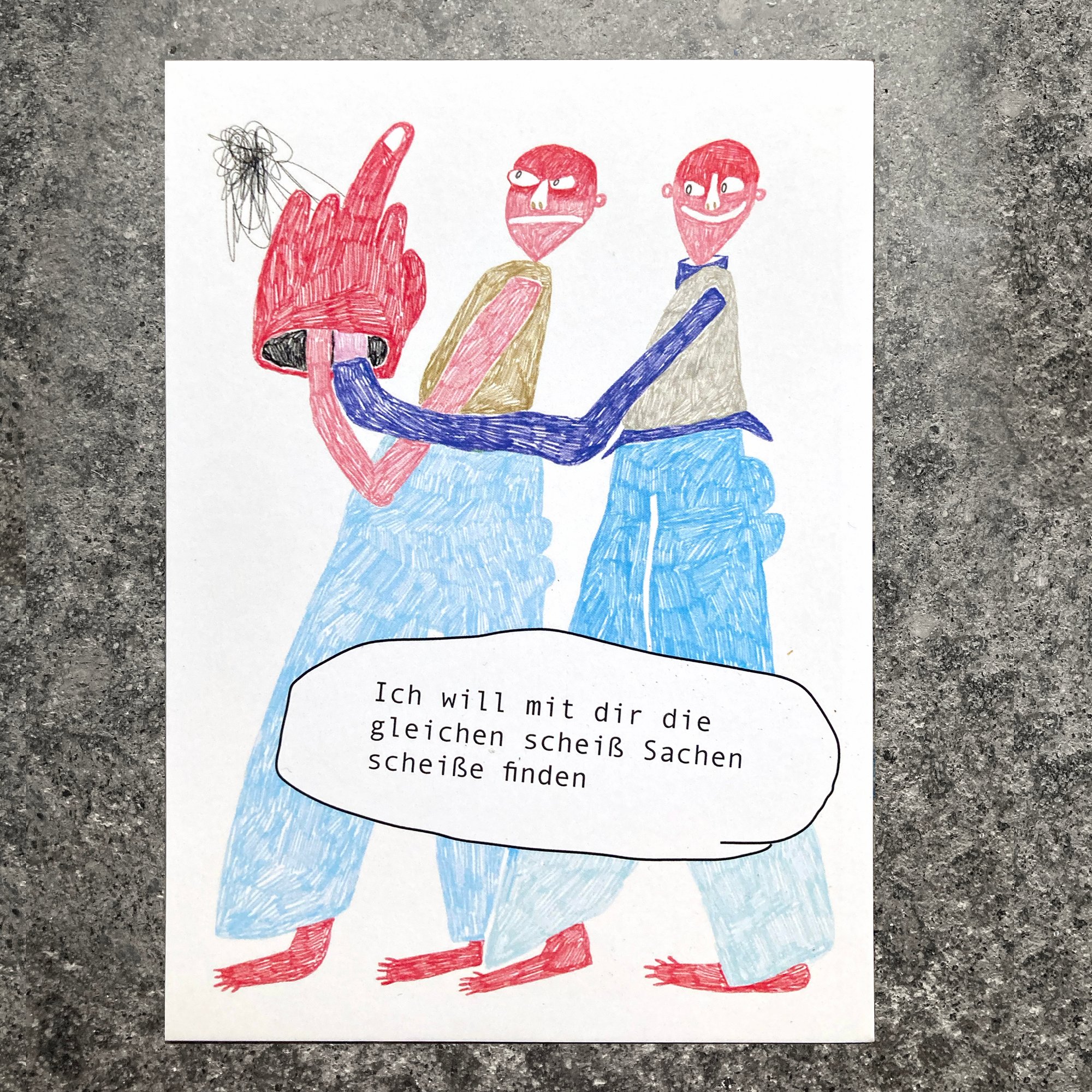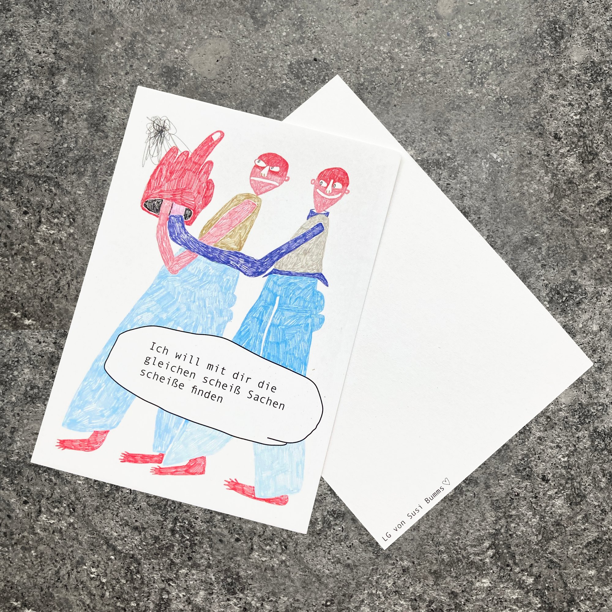 Diese Karte zeigt zwei Personen und hat zum Thema dass man mit wem die gleichen scheiß Sachen scheiße finden möchte.